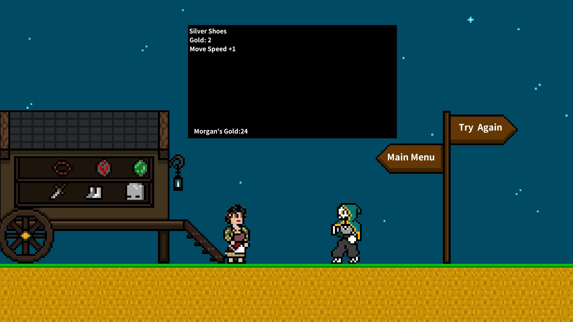 This game was made as my capstone project for my degree. Built in Unity the idea was a game where the items found were random but the level was not random. Money found during the level could be used to purchase temporary and permanent upgrades. I acted as director, producer, artist, and programmer on this project. I worked with two other seniors who also contributed to art and programming.At the time of this writing, it has been 5 years since I made this project. My memory has gotten hazy on how I participated in this game. I recall doing the tilesets, the enemy AI, player controls, the energy ball sprites that Lancelot used, player spell interactions with the environment (I'm especially proud of how I got the destructible wall working), the initial design, and the writing, the story and world building. The best laid plans go awry and while I had many plans thy were ultimately derailed by the pandemic.